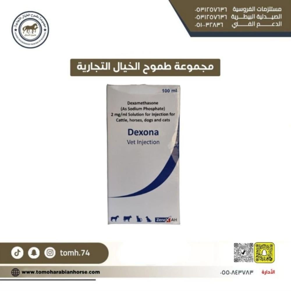 Dexona100 ml هو محلول للحقن البيطري يحتوي على ديكساميثازون (Dexamethasone) بتركيز 2 ملغ/مل على شكل فوسفات الصوديوم. هذا الدواء مخصص للاستخدام في الحيوانات مثل الأبقار، الخيول، الكلاب، والقطط.