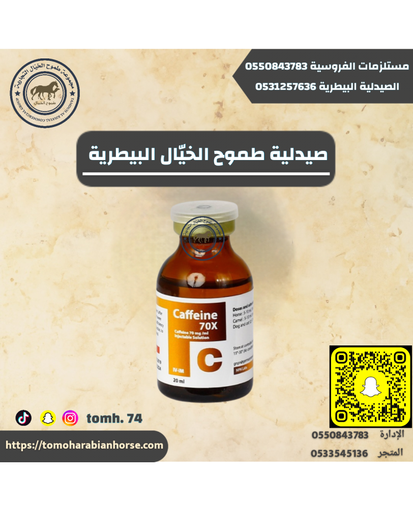 كافين ٧٠بالميه Caffeine70 منشط للجهاز العصبي المركزي ومدر للبول خفيف. يُقدر الكافيين لتأثيره الإيجابي على عمل القلب ، ويحسن الانقباض وصلابة ألياف العضلات. يقلل الكافيين من التعب ويزيد من الانتباه ويستخدم للمسافات القصيرة في سباقات الهجن .