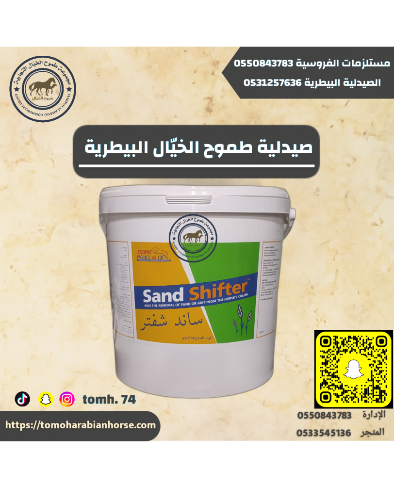 ساند شفتر منتج متخصص في إزالة الرمال من القولون، يقلل من احتمالية الإصابة بالمغص الرملي ويعزز صحة الجهاز الهضمي لدى الخيول.